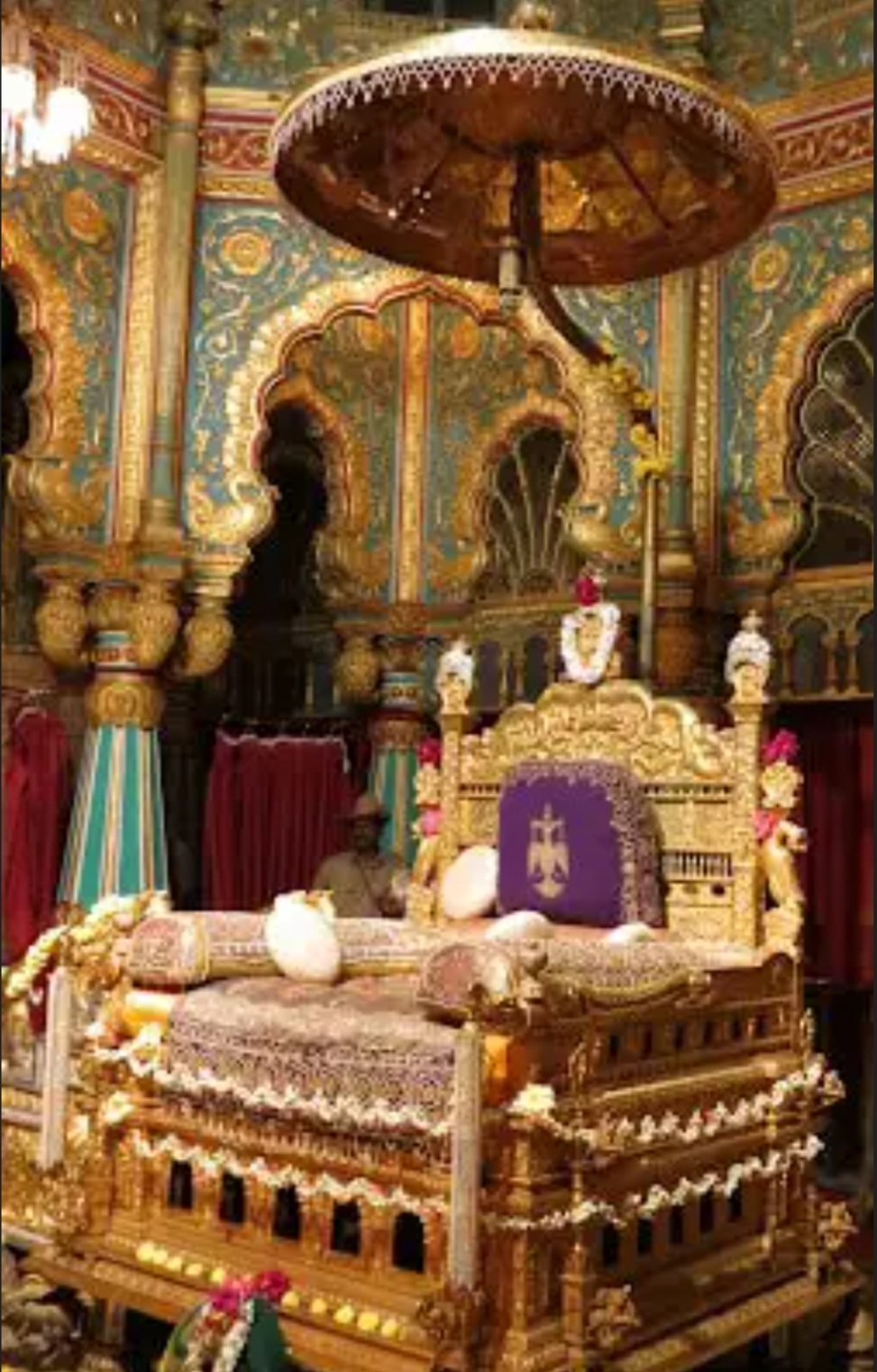 म्हैसूरच्या महाराजांची गोष्ट आणखीच निराळी होती. त्यांच्या सिंहासनावर अठ्ठावीस मण सोनं (साधारण 1120 किलो) जडवलेलं होतं आणि त्या सिंहासनावर चढण्यासाठी सोन्याच्या नऊ पायऱ्या तयार करण्यात आल्या होत्या. भगवान विष्णूंनी सत्यापर्यंत जाताना टाकलेल्या नऊ पावलांचं प्रतीक मानून या पायऱ्या तयार करण्यात आल्या होत्या.